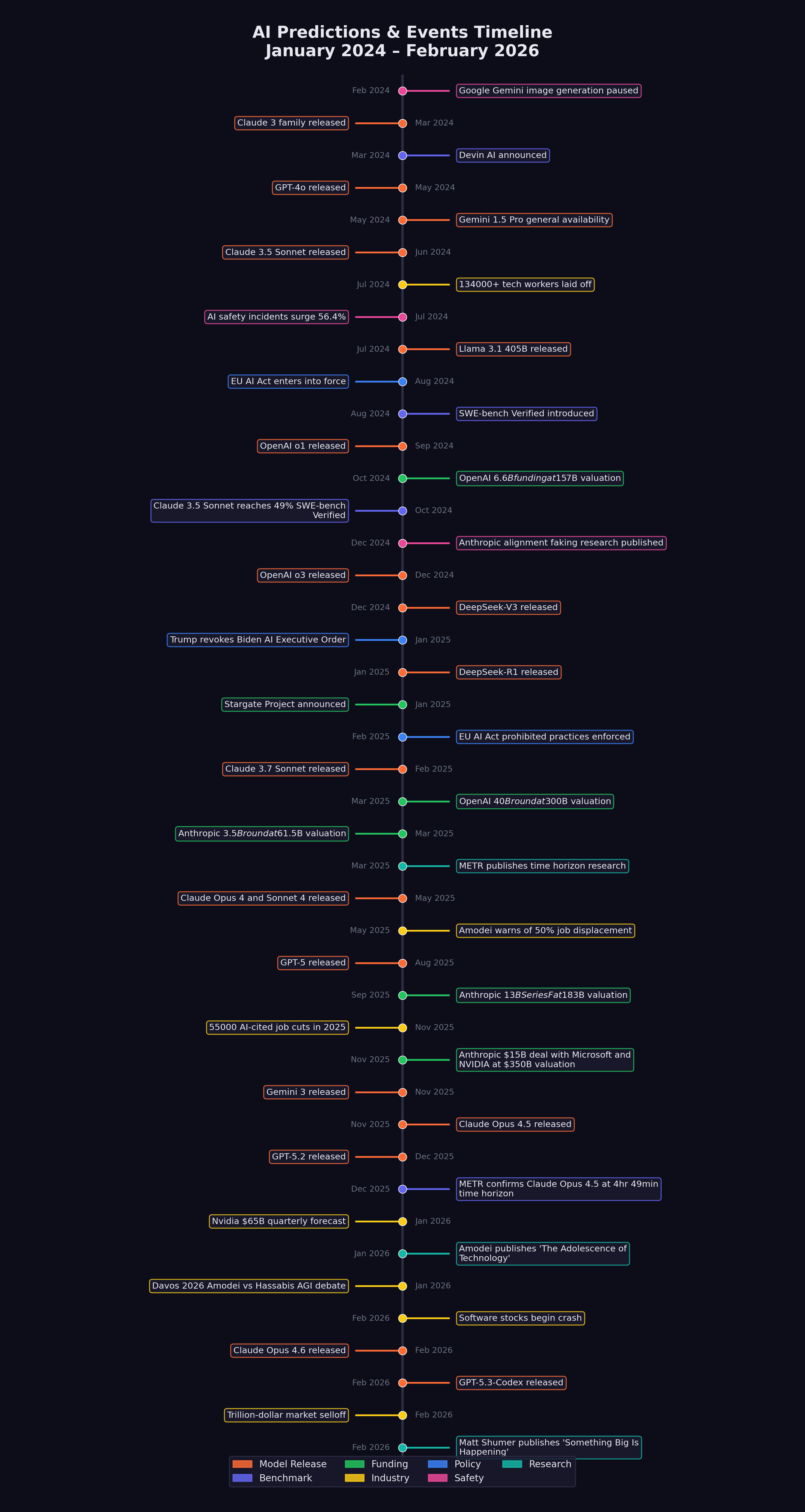 The pattern is striking. Through most of 2024, AI predictions were ambitious but abstract. By mid-2025, they began to be accompanied by concrete evidence: benchmark scores, job numbers, funding rounds. By early 2026, the predictions and the evidence were converging. The gap between what was being forecast and what was being measured was shrinking.