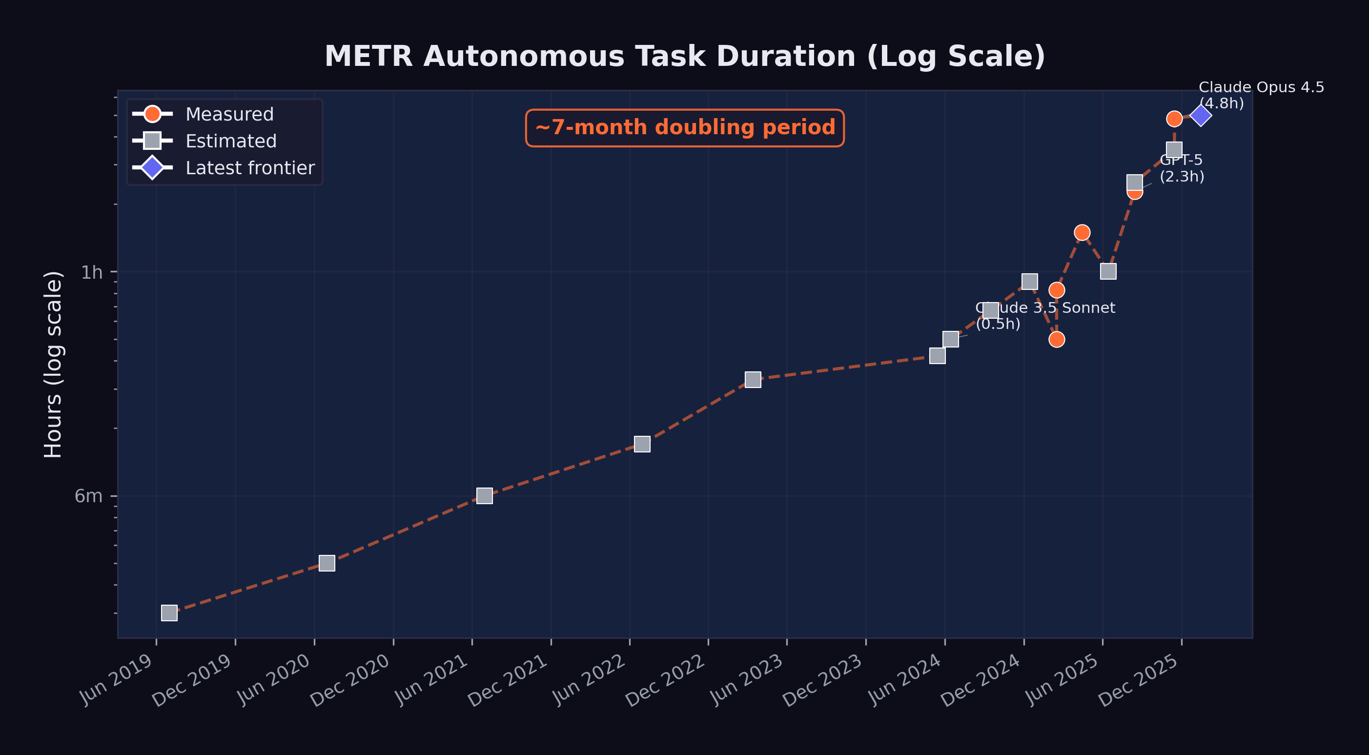 | Nov 2025 | Claude Opus 4.5 | 4 hr 49 min | Measured |