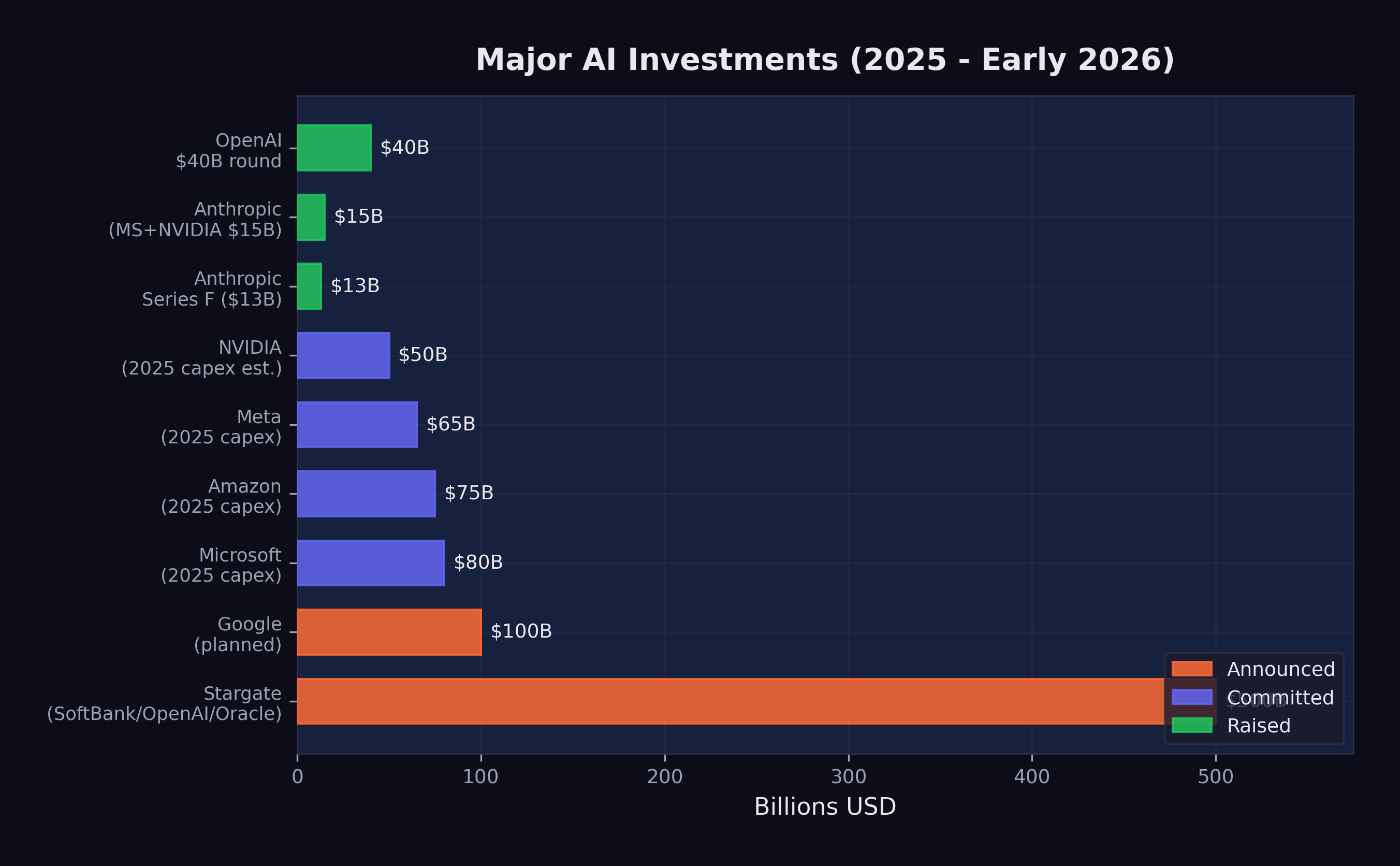 These numbers are not incremental. They represent a generational reallocation of capital toward AI development. The organizations making these investments are betting that AI capability will continue to improve rapidly and that the market for AI services will grow correspondingly. To put the scale in perspective: the combined AI infrastructure commitments announced in 2025 exceeded the GDP of most countries. The Stargate Project alone, at $500 billion, was roughly equivalent to the annual economic output of Sweden.