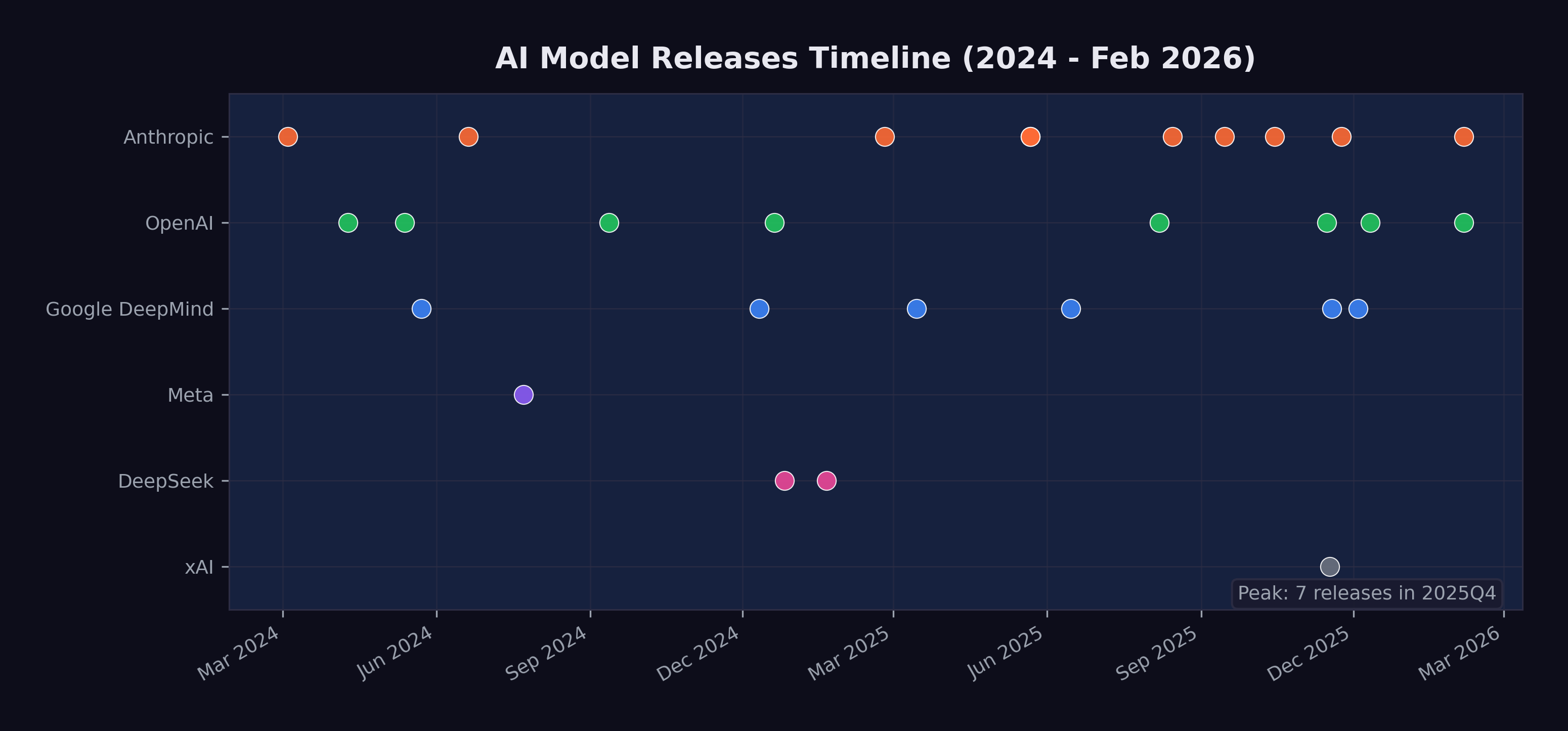 The previous two chapters examined specific metrics — SWE-bench scores and METR time horizons — that show AI capability advancing on exponential curves. But metrics are produced by models, and the story of those models is itself remarkable. Between March 2024 and February 2026, at least twenty-eight major AI models were released by seven organizations. That is more than one new frontier model per month, each pushing the boundaries of what the previous one could do.