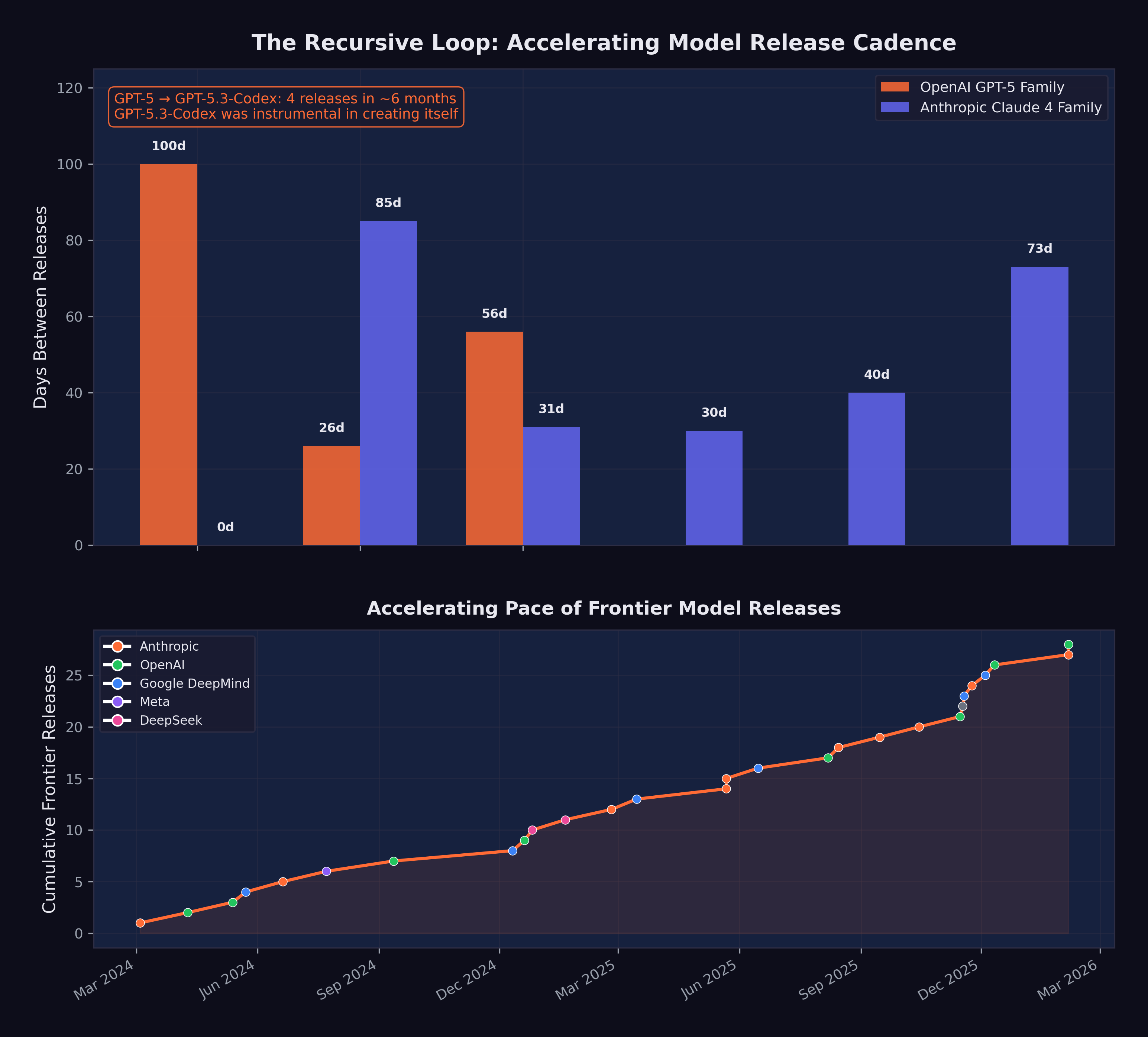 The February 2026 releases — GPT-5.3-Codex (“instrumental in creating itself”) and Claude Opus 4.6 (agent teams, million-token context) — were products of this accelerated loop (OpenAI 2026; Anthropic 2026). They were built, in substantial part, by the November models. And they were, in turn, more capable of building what comes next. The loop was tightening with each iteration, and the November Cluster was when that tightening became fast enough to see with the naked eye.