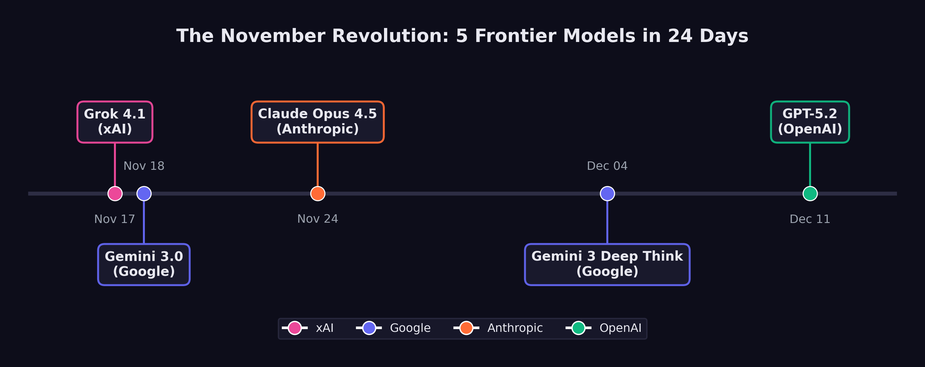 The two-day sequence — Grok 4.1 on November 17, Gemini 3 on November 18 — established the tempo for what would follow. This was not business as usual. This was a sprint.