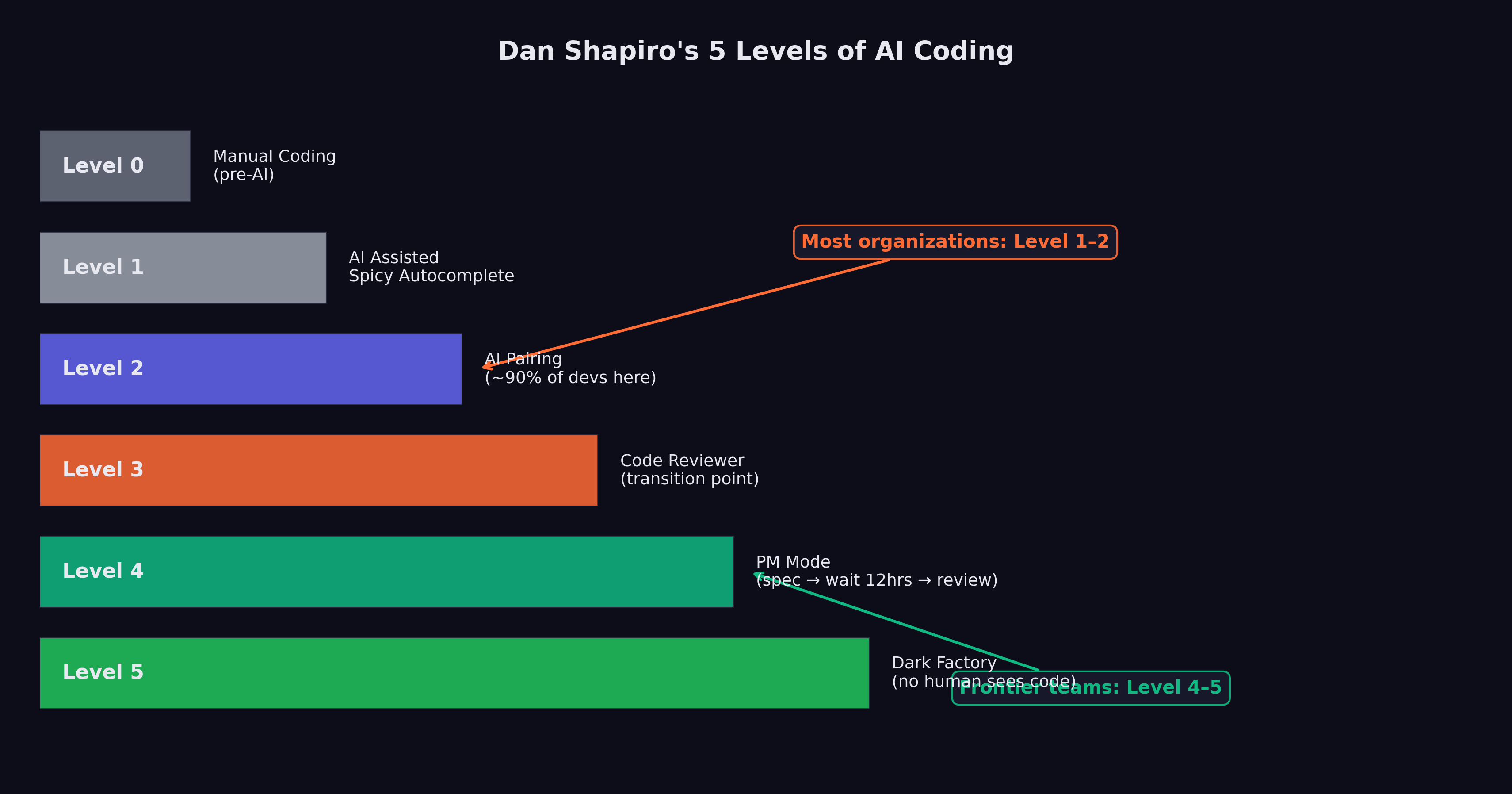 In January 2026, Dan Shapiro published “The Five Levels: from Spicy Autocomplete to the Dark Factory,” a framework that gave the industry a shared vocabulary for describing the rapidly shifting relationship between human developers and AI coding tools (Shapiro 2026). The framework drew an explicit analogy to autonomous driving levels, mapping the progression from full human control to full machine autonomy.