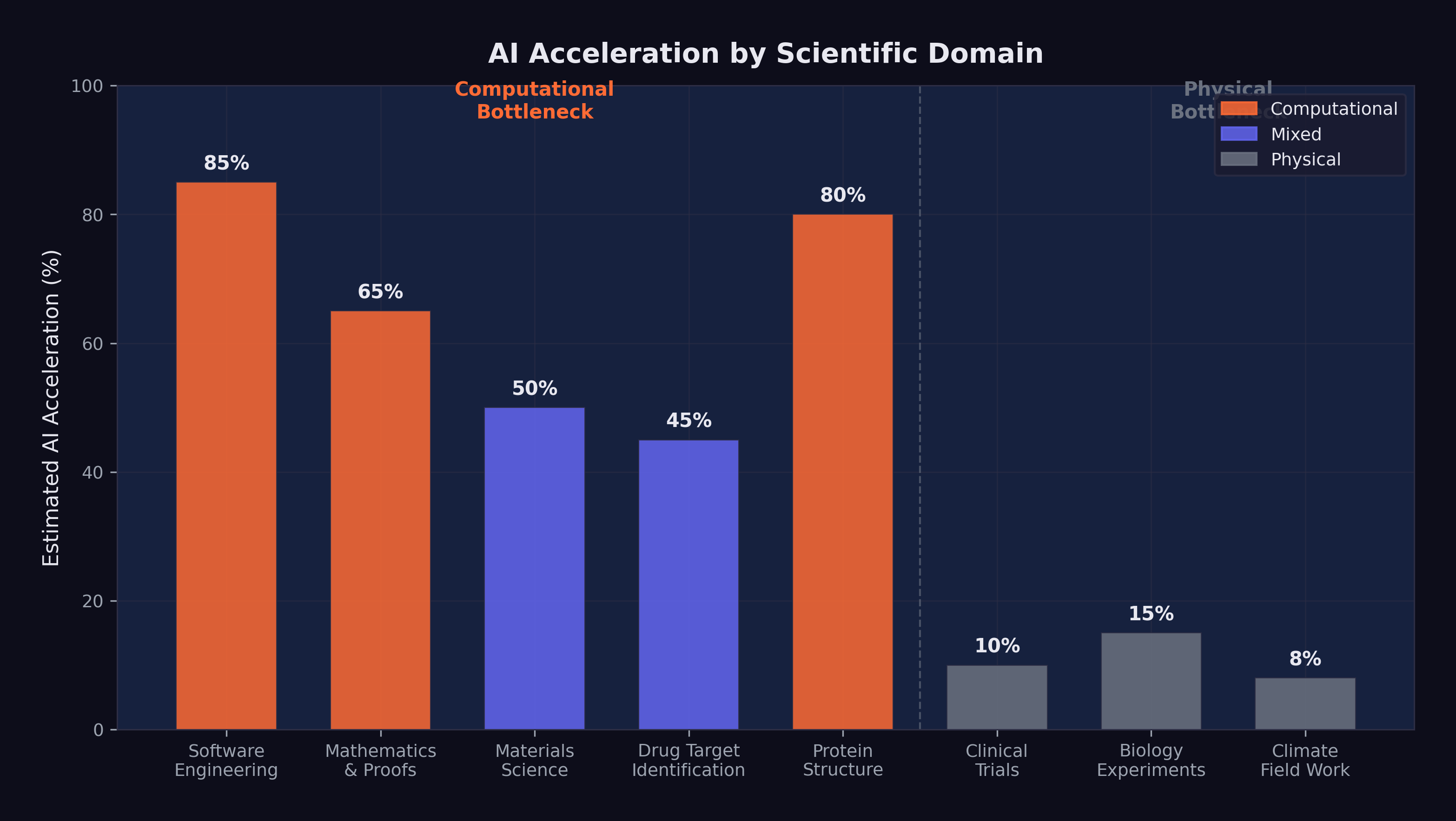 The figure captures the core dynamic: the fields closest to the computational end of the spectrum — mathematics, software engineering, theoretical physics — are experiencing the most dramatic acceleration. The fields closest to the physical end — clinical medicine, environmental science, experimental chemistry — are experiencing the least. Most scientific domains fall somewhere in between, with acceleration proportional to the fraction of their workflow that can be meaningfully aided by computation.